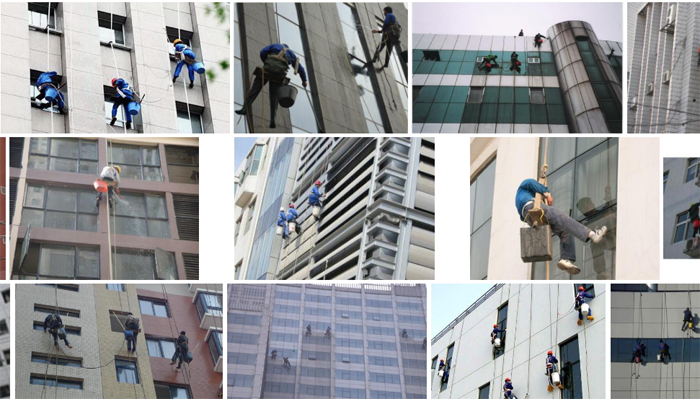 安全防范保护设施:作业方式从上到下。每擦拭完一行,整理工具、加清洗剂、横向移动吊板或吊篮,再继续下一行作业。